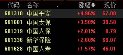 保险板块走强,中国平安涨近5%,股价创4年多新高。新华保险、中国人保、中国太保等纷纷跟涨。