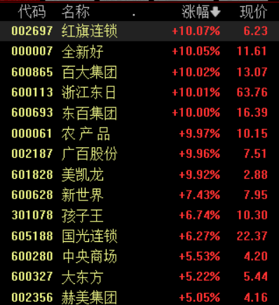 具体来看,大消费板块逆势爆发,阳光乳业、东百集团、全新好、皇氏集团等十余股涨停。